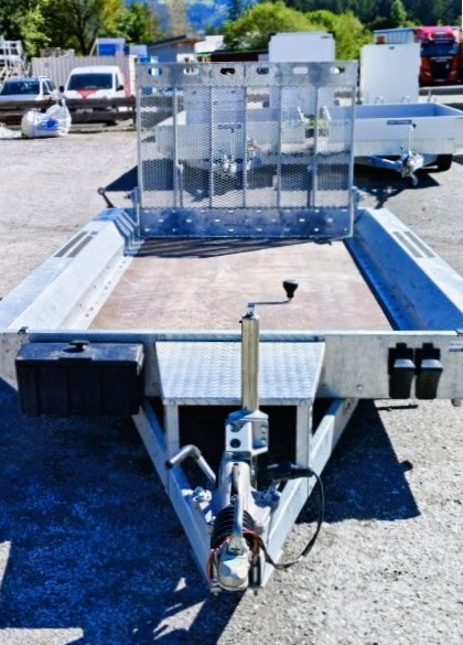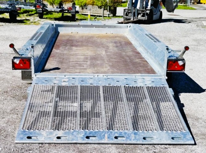 Robuster geschweißter Anhänger für den Transport von Baumaschinen und sehr schweren Materialien. Das originelle Design bietet die Möglichkeit, auf der gesamten Länge der mit Anti-Rutsch-Streifen ausgestatteten Seiten zu gehen. Geschweißter, tragender Rahmen aus geschlossenen Stahlprofilen. Rutschfester, wasserfester Sperrholzboden mit soliden Bodenklammern zur Ladungssicherung, um die Sicherheit der transportierten Güter zu gewährleisten. Äußerst robuste V-Deichsel und stabilisierende Auflaufstützen. Sitzbankstütze und Stützrad mit automatischer Klappung serienmäßig. Federn, die das Absenken und Anheben der Rampe erleichtern.