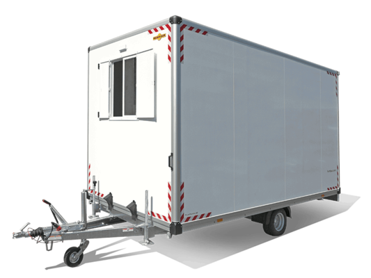Der mobile Aufenthaltsraum mit allen Bequemlichkeiten. Der Bauwagen-Anhänger bietet Platz für bis zu 6 Personen und kann optional mit einer festen Sitzgruppe, bestehend aus zwei Sitztruhen und einem Tisch, ausgestattet werden. Der Bauwagen-Anhänger lässt sich mit umfangreichem Zubehör ausstatten und auf Ihre Bedürfnisse entsprechend anpassen – z.B. mit Heizlüfter, Schiebefenster in Stirn- und Seitenwand, Dachfenster, Einspeisesteckdose 230 V, Verteilerkasten etc.