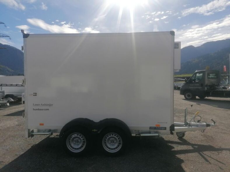 Die Kühlanhänger der Modellreihe HGK Deluxe Tandem bieten alles, was für den sicheren Transport gekühlter Waren notwendig ist: die Kühlzelle ist aufgebaut aus 60 mm starken PurFerro-Sandwich-Paneelen mit einem Kern aus geschäumten Polyurethan mit einer beidseitigen Beschichtung aus verzinktem und pulverbeschichtetem Stahlblech. Der 65 mm starke Isolierboden ist mit einem Antirutschbelag ausgestattet, der für sicheres Be- und Entladen sorgt und durch den höheren Reibungswiderstand auch bei der Ladungssicherung seinen Beitrag leistet. Dieser Boden ist optimal isoliert und lässt die Kälte erst gar nicht nach unten entweichen. Die doppelflügeligen Kühltüren sind abschließbar, können im Notfall aber immer auch von Innen geöffnet werden. Sie sind über Edelstahlscharniere mit dem Anhängeraufbau verbunden. An den Innenwänden ist eine 150 mm hohe Scheuerleiste aus Aluminiumblech befestigt. Rahmen und Fahrwerk sind aus feuerverzinktem Stahl gefertigt, ebenso das geschweißte Heckportal. Vier schwenkbare Teleskopkurbelstützen ermöglichen den sicheren Stand des PKW-Anhängers. Die Einfassungen des HGK Deluxe Tandem bestehen aus eloxiertem Aluminium, ebenso die Regenrinne am Heck. Für jeden Bedarf findet sich der passende Tandem-Kühlanhänger: Modelle mit zulässigem Gesamtgewicht von 2000 kg bis 3500 kg sind verfügbar, die Nutzlast beträgt modellabhängig zwischen 1329 kg und 2229 kg, die Ladehöhe variiert je nach Modell zwischen 590 und 630 mm. Das eingesetzte Kühlaggregat des Markenherstellers Govi erlaubt eine Temperatur im Kühlanhänger von +2°C bis +10°. Das Kühlaggregat wird über 230-V-Netzspannung versorgt und arbeitet bis zu einer maximalen Außentemperatur von 40°C. Eine Kühlung während der Fahrt ist bauartbedingt bei diesen Anhängern nicht möglich.