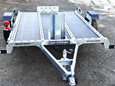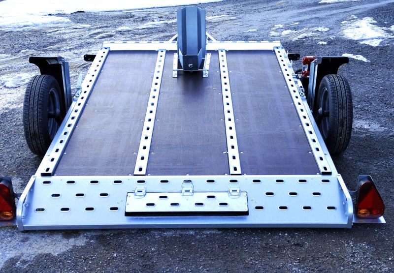 Plattform mit der Möglichkeit der hydraulischen Absenkung der Transportfläche zum Beladen von z.B. Motorrädern mit einem sehr geringen Anfahrwinkel. Möglichkeit der Montage von bis zu 3 mechanischen Radsicherungen für zusätzliche Sicherheit beim Transport.